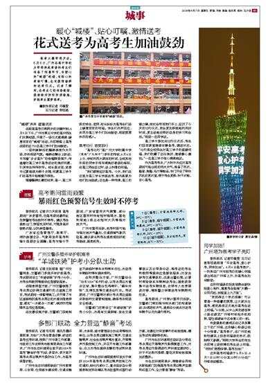 “我觉得这个形式很棒!可以营造一种温馨的氛围,让大家关注高考,感觉是很正式地为高考生送上祝福。”6日晚,从中山来的游客李小姐在游览广州塔时举起手机拍照,留住旅游途中这有意义的一刻。