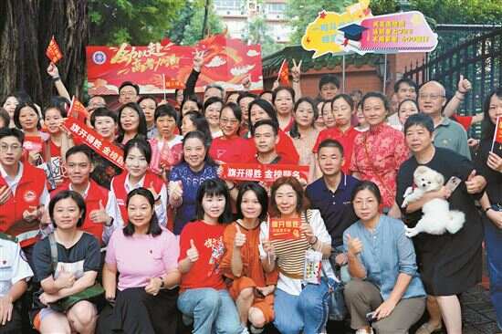 在广州市第十六中学,上午7时40分,考点门前开始络绎不绝。不少家长穿戴着寓意好运的红色服装,如写着“金榜题名”的红色T恤,红色旗袍、红色丝巾等;有家长手持鲜花,为即将踏入考场的孩子加油打气;也有家长和孩子肩并肩在校门前合影,记录重要瞬间。师生间击掌鼓劲,亲子间拥抱祝福,考点门前弥漫着满满的仪式感和温情。
