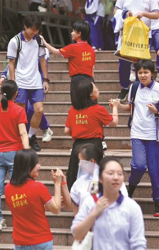 ■广州市第十六中学考点门口,语文考试后考生们轻松走出考场。