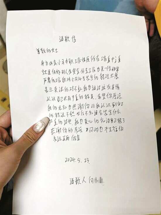 ■吴女士晒出外卖小哥的道歉信。新快报记者 贾典/摄