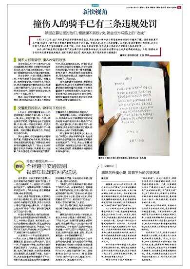 面对新快报记者的采访,吴女士说:“我明白大家生活都不容易,我也没有受什么很严重的伤,那就按正常程序去处理就好了。”不过,吴女士透露,在处罚期间,她发现这位外卖小哥之前还有三条违规处罚,都是摄像头拍摄到的不按车道行驶。