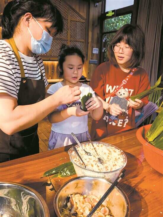 广州融创乐园推出“粽”享非遗活动,广大游客朋友们不仅可以亲手体验制作香粽,还可以观看“打铁花”“杂技荟萃”等一系列非遗表演。岭南印象园“非遗龙狮巡游”活动热闹非凡,百米长舞龙和醒狮队伍,穿行园区街巷,场面非常壮观。宝墨园上演山水实景展演《荷以笙箫》,演出中屈原乘一叶扁舟而来,于荔景湖之上吟诗。