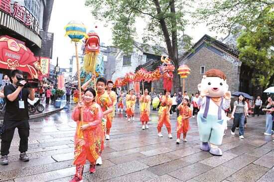 ■广府龙狮队伍在沙湾非遗古镇巡游。