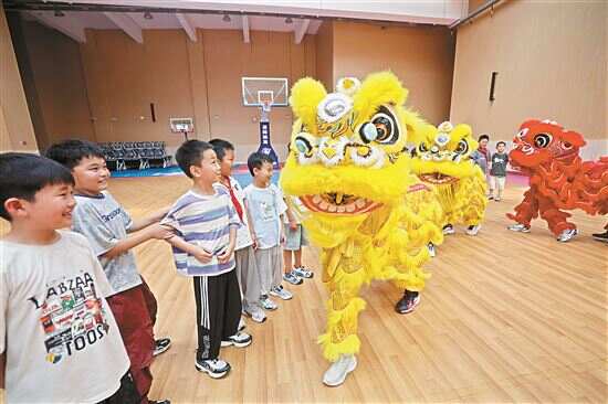6月13日,织里镇吴兴实验小学学生在专业老师的指导下练习舞狮。