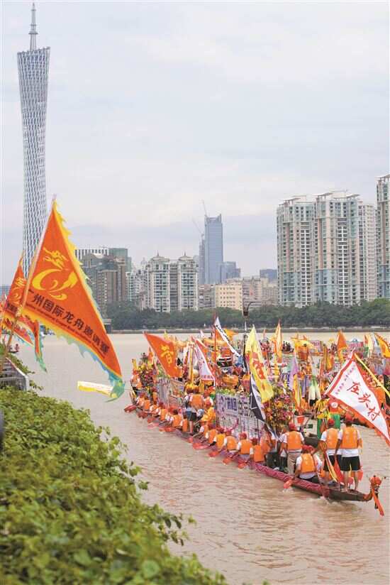 ■二十余条装饰精良的彩龙在珠江竞艳,展现别具一格的岭南龙舟文化。