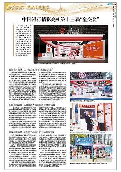 6月21日,第13届中国(广州)国际金融交易·博览会(下称“金交会”)在琶洲中国进出口商品交易展馆开幕。八方汇聚金融盛会,中国银行已连续13年参展金交会。本次中行展馆以“全力做好‘五篇大文章’,助力建设金融强国”为主题,设立服务实体、综合经营、数字金融、普惠金融等主题展区,采用外方内圆、交互开放的设计风格,将为现场观众带来别具一格的参展体验。