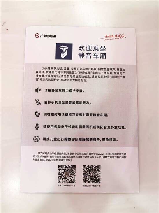 据广铁集团客运部相关负责人介绍,广铁首批在广州南-上海虹桥G818次、上海虹桥-广州南G819次、香港西九龙-北京西G80次、北京西-香港西九龙G79次、深圳北-香港西九龙G5619次、香港西九龙-深圳北G5656次等6趟列车设置“静音车厢”。“静音车厢”统一设置在3号车厢,“静音车厢”客室两端墙壁显眼位置、客室端门均粘贴有“静音车厢”标识,同时,在每个座椅后网兜内均放置有一张“静音车厢”服务提示卡。