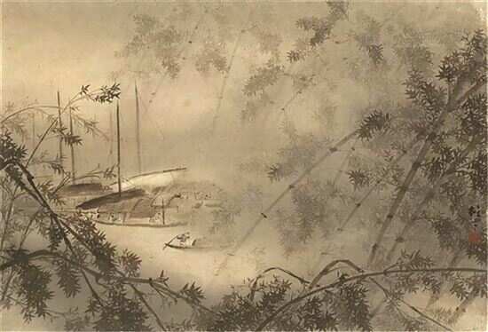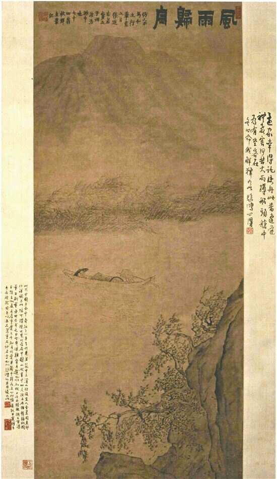 同为南宋的苏显祖画的《风雨归舟图》,据传是传世孤本。画中烟云莽莽,雨气蒙蒙。画面的右上方,明代画家沈周题七律一首,其中两句是这么写的,“领略风雨诗思好,规摹粉本墨痕迟。”强化了风雨的诗意。