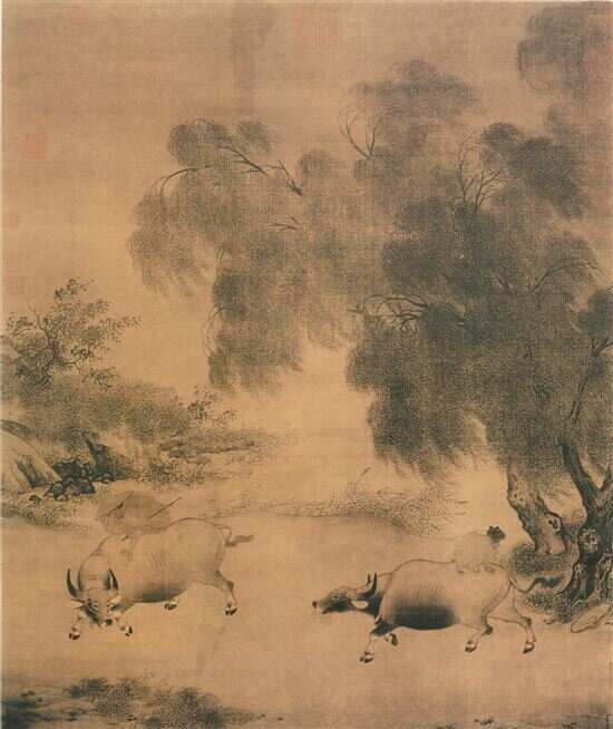 南宋夏圭的《冒雨寻庄图》,通过树的摇摆与顶风前行的人表现了风雨中的赶路情形。李迪的《风雨牧归图》则描绘风雨即将来临时,两个牧童赶牛回家的情景,是一幅具有风俗性质的小景山水画。画中以极简洁的场景,却烘托了一个极充实的情境,整个牧童、牛、大树、湖水、苇丛等景物都被置于忽来的风雨主题与气氛之中。