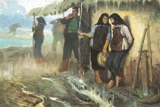 再后来,油画家黄文波的《春雨》也是一幅经典作品。作品描写一场及时的春雨给人们带来的喜悦,画面最别开生面的情节是描写一名村姑用双手接雨水。另外,还描写一个农民干部形象的男性欲丢掉吸着的烟蒂,思考如何借春雨的时机大干一场的细节。著名美术评论家梁照堂认为,“这幅作品在当时,给人一种非常新鲜的印象,通过农民避雨的场面来表现了他们对农村生活热情的景象。”几乎同期则有版画赵瑞椿的《春雨》、潘行健的《骤雨》。