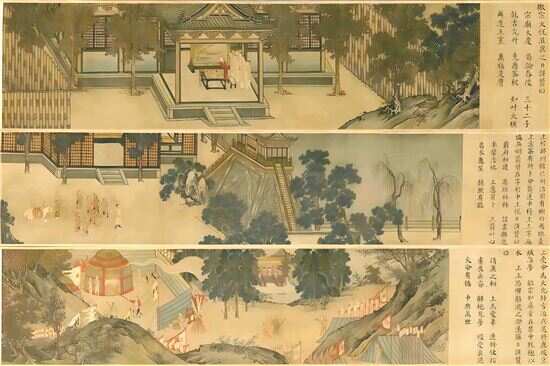 要了解仇英的这件作品,似乎不得不先了解《瑞应图》的来源。简单地说,《瑞应图》是南宋早期,宫廷为了说明赵构皇位的合法性,叙述曾经发生在赵构身上的十二件祥瑞事件。宫廷让当时画院画家绘制为十二段绘画,加上十二段“赞词”(说明文字),构成一件完整的作品。这是当时的“重大主题性创作”,而且内容复杂、规模庞大,当时画院的画家(有十多个人),其中多人画过《瑞应图》,可以视为南宋早期最重要的“主题性绘画作品”。