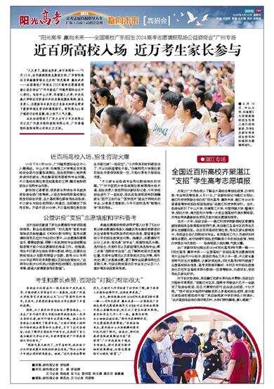为助力广大考生深入了解各大高校在粤招生政策、办学优势、专业特色等信息,6月17日,广东新快报社与湛江日报社、湛江科技学院联合举办的“阳光高考 赢向未来 湛江市2024年普通高等学校招生现场咨询会”在湛江科技学院举行。当天,咨询会吸引了中山大学、华南理工大学、中国传媒大学、暨南大学、深圳大学、南方医科大学等一大批全国高校代表齐聚现场,为考生带来最新招生资讯及面对面志愿填报指导。