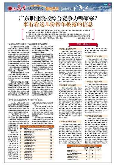 在“金平果”榜的前100所名单中,广东院校共有8所。除了以上4所外,还有广东机电职业技术学院、广东科学技术职业学院以及广州铁路职业技术学院、广东水利电力职业技术学院。