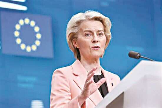■3月21日,在比利时布鲁塞尔,欧盟委员会主席冯德莱恩在欧盟峰会期间出席新闻发布会。新华社发