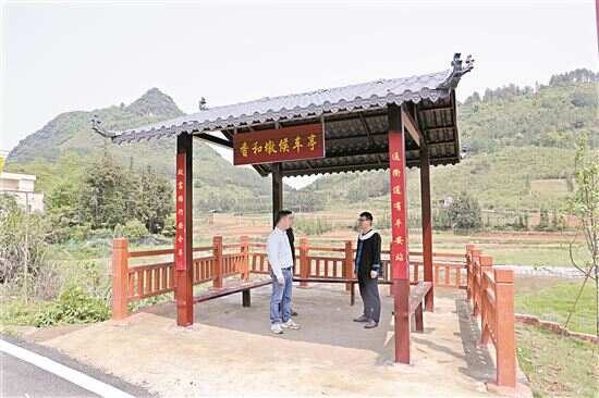 ■在三排村由社会组织捐建的候车亭,驻三排镇工作队队员邬维国(左)与三排村干部交流。