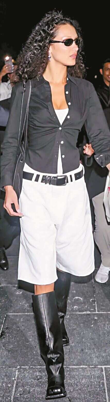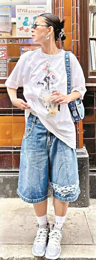 如果从服装的 “气质” 来看,衬衫多数代表职业、知性,过膝牛仔半裤则曾是嘻哈、街头的代名词。但也正是这种矛盾感,碰撞出与众不同的时髦度,可将蓝色牛仔换成白色或黑色,基础色能加持造型的“正式感”。