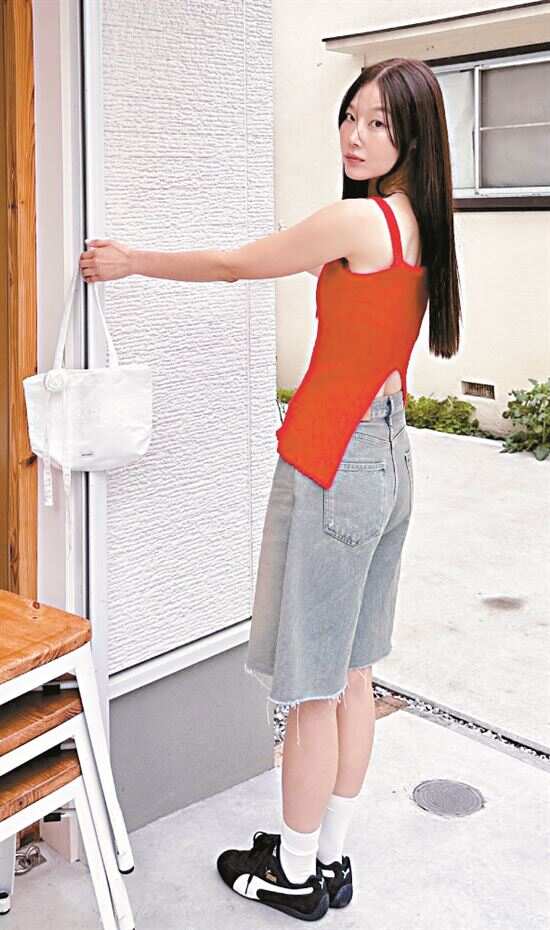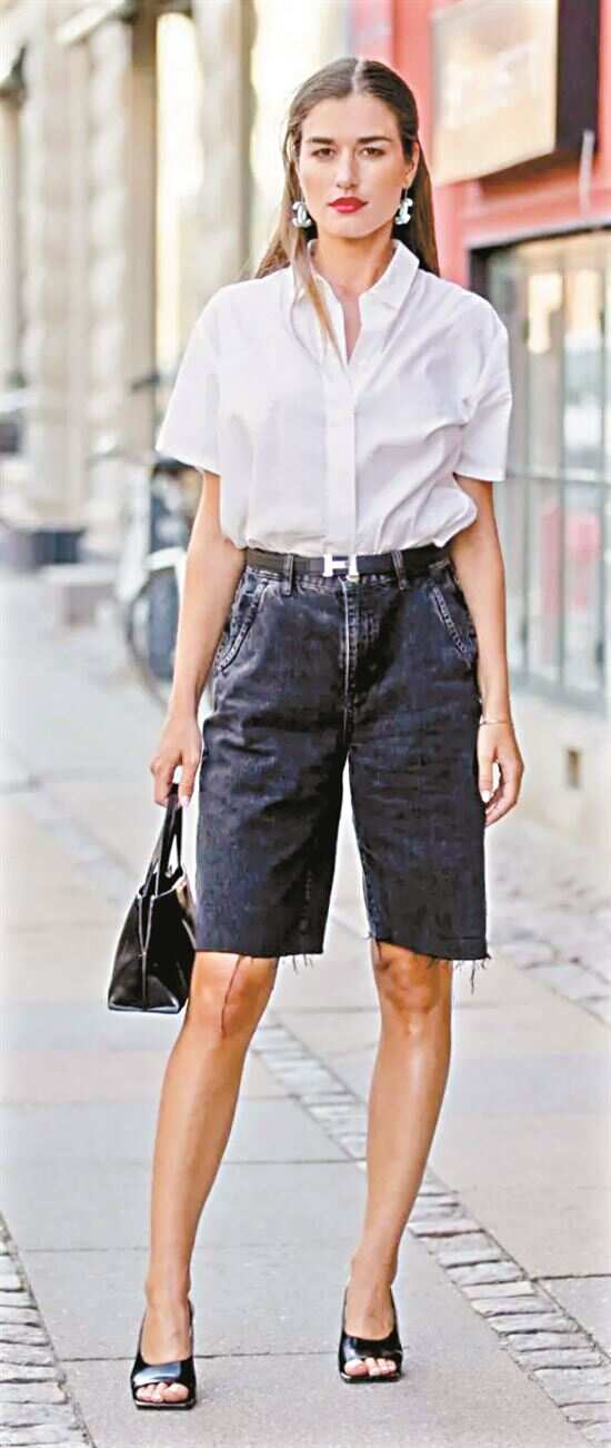 ■合体的衬衫与牛仔半裤搭配,通勤也不违和,硬朗的裤装线条更显干练。