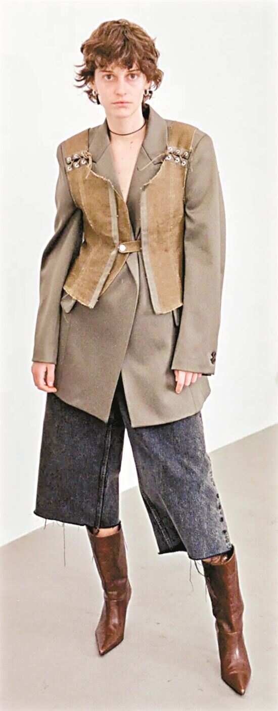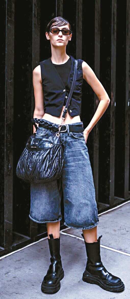 ■短款西装马甲跟低腰过膝的牛仔半裤也很 “登对”,搭长靴长袜视觉上延长腿部线条,营造帅气。