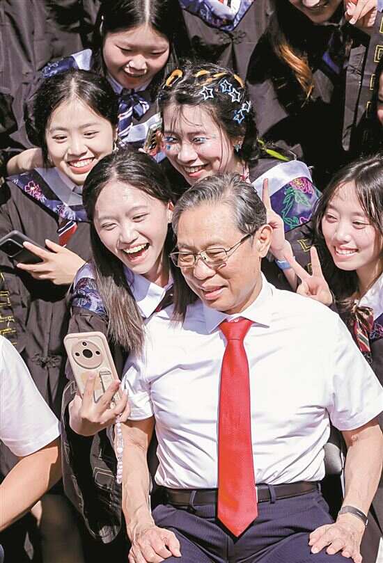 ■“共和国勋章”获得者、中国工程院院士钟南山与广州医科大学毕业生合影留念,送上祝福。