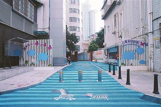 ■越秀区白云街道筑南社区“最美上学路”成宜学标杆,天蓝色的沥青路面让人耳目一新。 新快报记者 郭思杰/摄