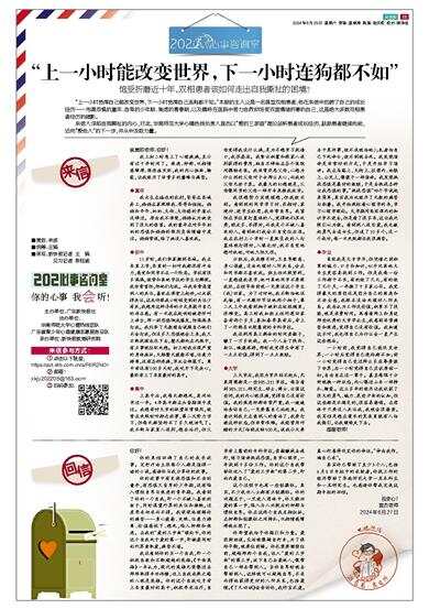 来信人深陷自我撕扯的内心,对此,华南师范大学心晴热线负责人袁杰以“爱的三部曲”理论剖析患者成长经历,鼓励患者继续向前,迈向“爱他人”的下一步,并从中汲取力量。