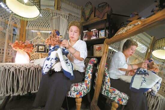 ■王娟抱着曾经获奖的作品,一点一点细心编织。房间里的沙发、桌布、屏风、灯罩、挂饰、包包……都是她一针一针亲手编织的。
