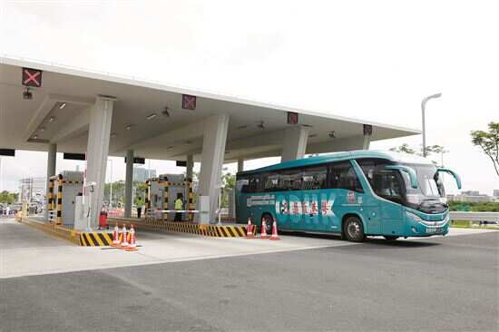 ■6月30日下午3时,首辆进入深中通道的大巴车。