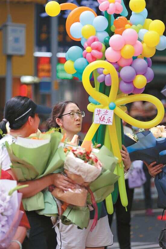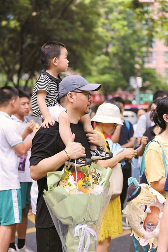 广东外语外贸大学实验中学考点门口在考试结束前20分钟,就聚集了大量接考团。很多妈妈穿着旗袍,手捧鲜花,还有身着动漫服装的年轻人前来接考。记者留意到,一名“显眼包”爸爸尤为引人注目,他手持“零食捧花”,站在石墩上,满心期待地看着考场大门。
