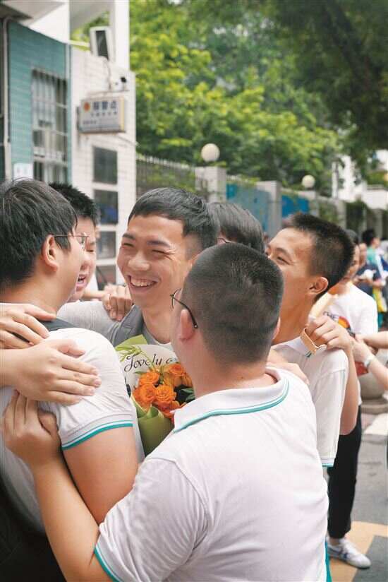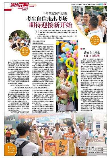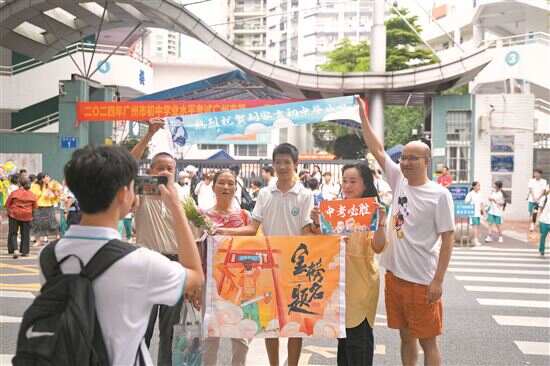 7月2日,2024年广州中考笔试顺利结束。新快报记者在多个中考考点看到,考生们带着轻松的笑容走出考场,等待着他们的是亲友团的鲜花和拥抱。