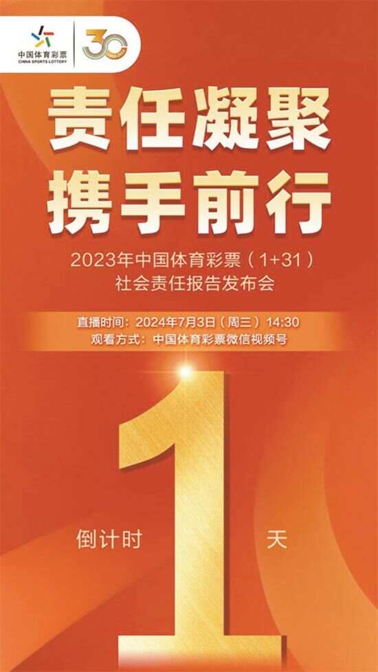 新快报讯 记者陆妍思 通讯员关言报道 7月3日,“责任凝聚 携手前行” 2023年中国体育彩票(1+31)社会责任报告发布会将在北京举行。国家体育总局相关部门、人民网、国家体彩中心相关负责人,省市体彩中心代表、社会责任领域专家、体育行业专家及彩票行业代表将出席发布会,共同回顾和见证中国体育彩票2023年在社会责任建设方面所取得的成果。