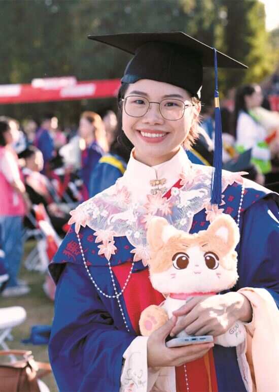在广东外语外贸大学也上演了一场“新中式”毕业穿搭秀。本科毕业生王鑫月穿着新中式学位服在林荫小道上拍照,吸引了众多目光。另一名毕业生叶燕婷佩戴着以枫叶刺绣为主要元素的云肩,搭配丝绸缎带和珍珠长链,寓意春华秋实。“希望在毕业典礼上用中国元素为我的学业画上句号。”叶燕婷说。