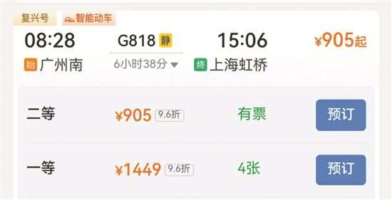 朱先生所选择的广州站到长沙南站的G6112次高铁仅需2小时25分钟。票价上还便宜了不少,像朱先生买的二等座才250元,而广州南站出发到长沙南站这个时间段的两趟车的二等票都要300元以上。最便宜的是314元,贵一点要347元。“贵的相差了差不多100元,再加上我就住在小北路附近,坐地铁一下就到了。我们一家三口这一趟可以省不少。而且最重要是这趟车没有那么抢手,而南站出发的列车都是在开售后迅速售罄的。”朱先生这样告诉记者。