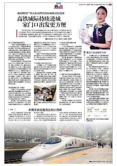 记者从广州火车站获悉,今年全国铁路实施三季度调整列车运行图后,广州站共开行营业列车76对,其中普速列车39对,高铁和城际列车37对,高铁和城际列车动车组占开行总数的近一半,老站客运能力进一步提升。