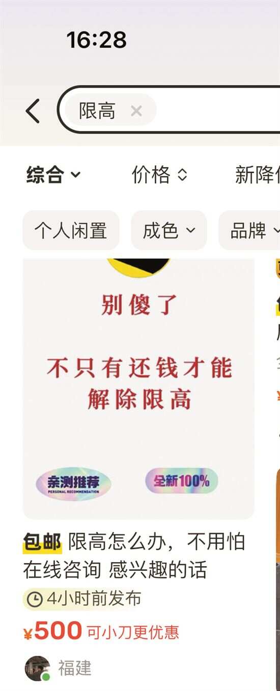 然而一年之后,新快报记者在某鱼电商平台上输入“限高”,依然能出现协助限制高消费人群出行的产品。有的产品以民航班机图片甚至商务舱图片为商品主图,产品简介中直接写出“限高,机票,失信人”的字样,明示可协助被限制高消费的人群购买机票。有产品图片甚至堂而皇之地写出“限高令解除 勇敢的人先享受”的字样。在有买家咨询之后,这些商家均通过暗语“V聊” “家威”等要求买家添加个人微信,绕过平台监管来完成下一步沟通和交易,并加价700元-2000元不等的手续费。