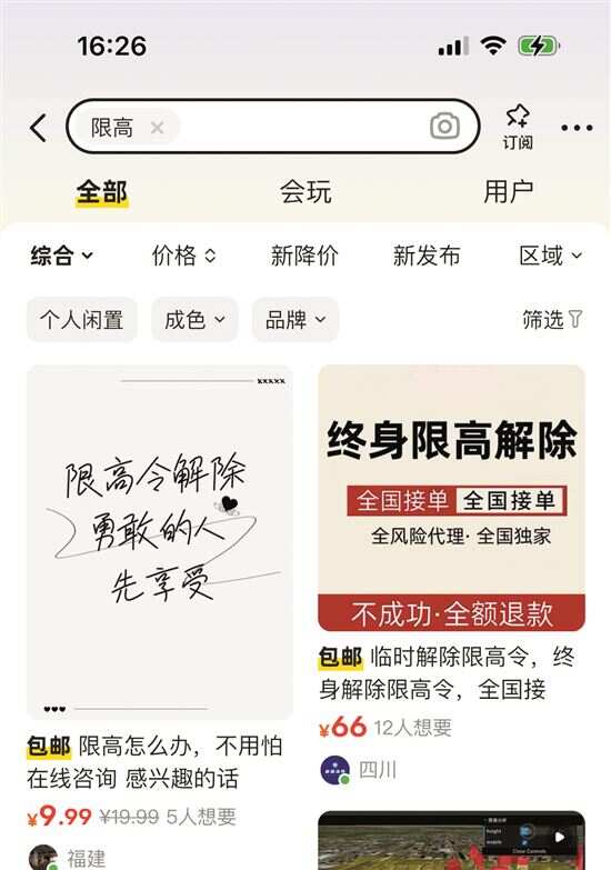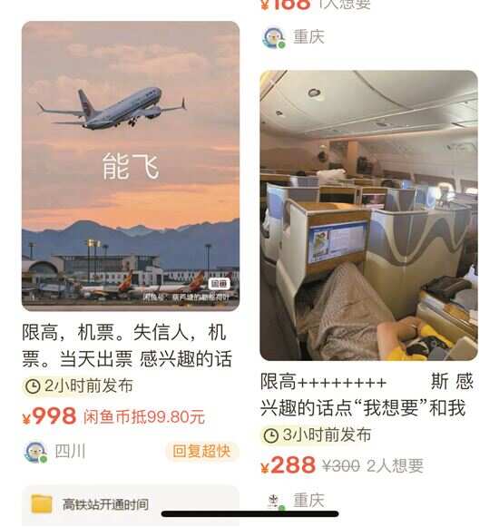 ■某鱼平台上帮助老赖突破“限高令”坐飞机的不法业务页面。