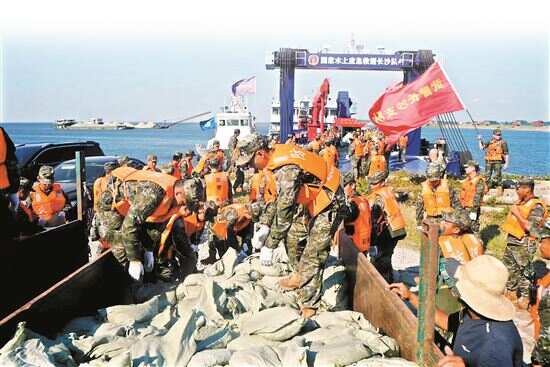 ■7月6日,武警湖南总队官兵在湖南省岳阳市华容县团洲垸受灾现场第二道防线搬运沙袋加固堤坝。新华社发