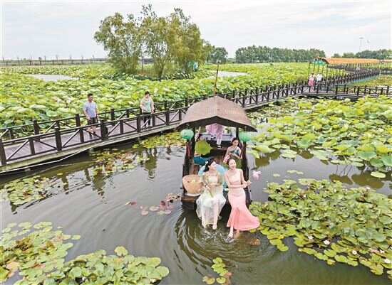 ■7月6日,游客在江苏省兴化市万亩荷塘景区观看民俗表演。