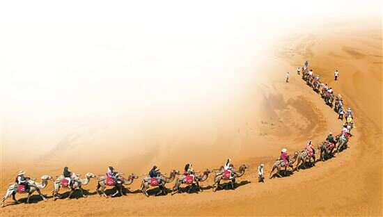 ■7月5日,游客在宁夏中卫市沙坡头旅游景区体验骑骆驼。