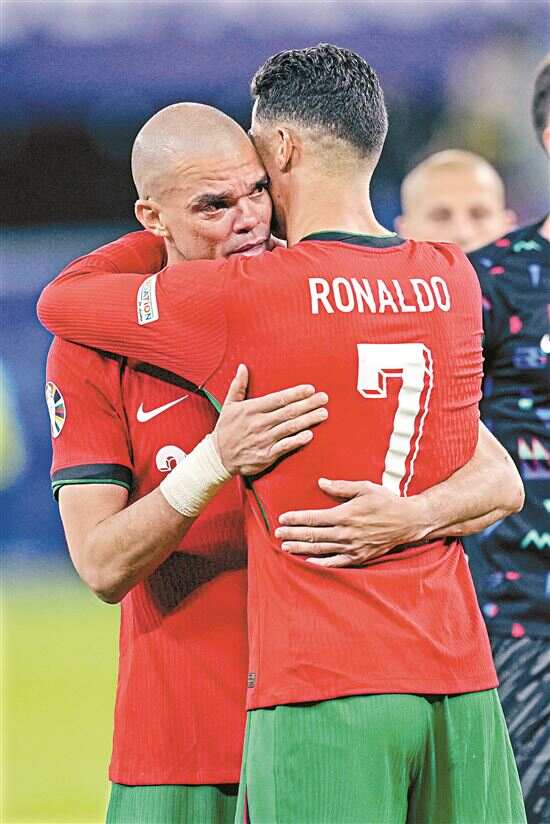 ■7月5日,葡萄牙队球员克·罗纳尔多(右)比赛后安慰队友佩佩。新华社发