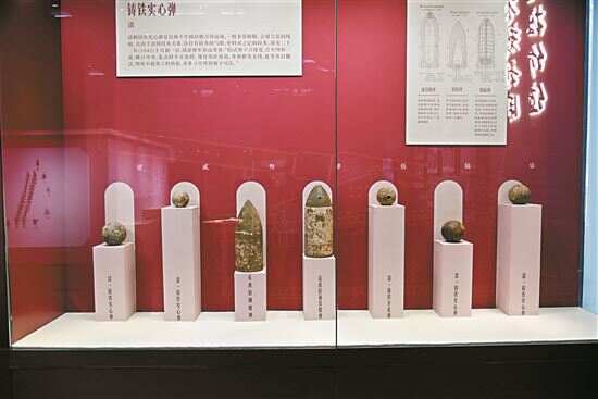 ■清代铸铁实心弹以及克虏伯钢榴弹等。“长洲要塞史迹展”现场。穗文考供图