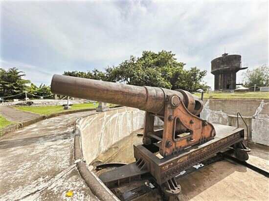进门是一条短短小径,已经芭蕉叶森,硕大叶子似乎在展示和平年代的长久安宁。前方青砖砌成的炮巷,则勾起从前那段保家卫国的历史记忆。这里原有炮台四座,今存炮台三座,穿行炮巷中,走进中间一处炮台,可见一尊比人还高的克虏伯炮(仿制),在烈日炙烤下,闪耀着坚定的金属光芒。
