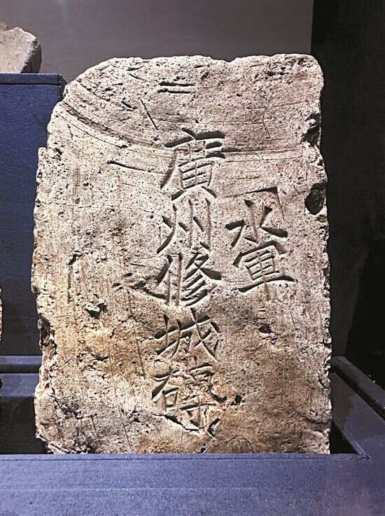 1972年,广州市文物管理委员会在越华路西段,发现宋城墙遗址,“该遗址南北走向,东西宽6.6米,南北长度仅揭开2米”。城墙砖多为青灰色,少数在其扁平一面有“水军修城砖”或“广州水军修城砖”等戳印。日前,记者在广州博物馆内看到了一件“广州水军修城砖”展品,其大小正如一本厚厚大百科全书,上面七字如遒劲封面题字。