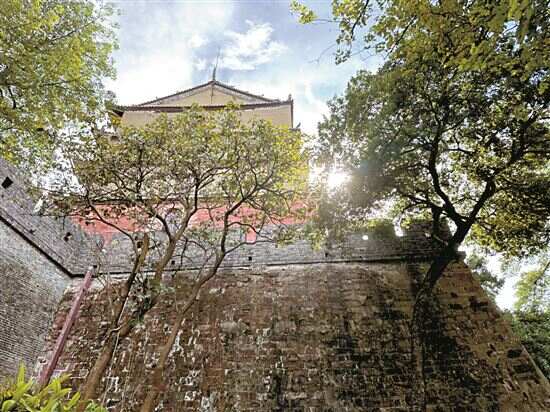 而就在越秀山上,至今保存有一段用红砂岩条石砌基、青灰色大砖砌筑的明代城墙,现存总长度1137米。