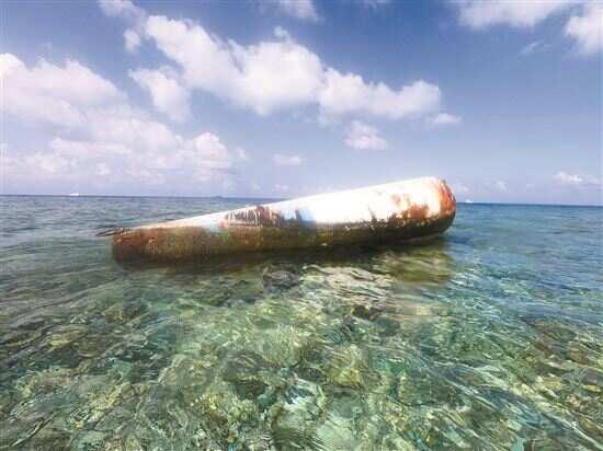 ■非法“坐滩”军舰北侧浮筒。新华社发