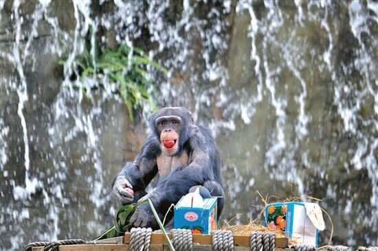 7月9日,广州动物园里的黑猩猩在水边吃水果。时过小暑,广州迎来连续高温天气,动物园为动物们准备了多种特制的消暑食物。新快报记者 郭晴/摄