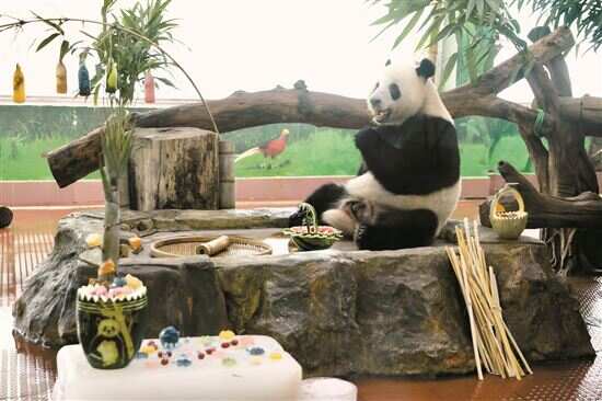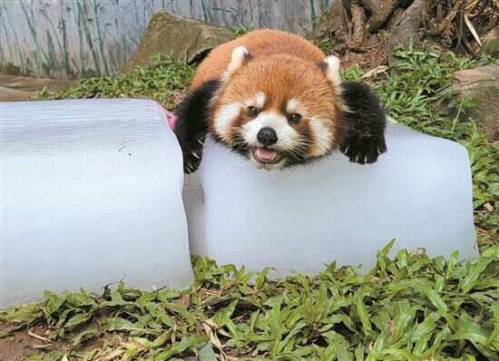 国宝大熊猫喜冷怕热,当室外温度超过26℃,就会进入室内避暑。记者在空调房里看到,保育员为熊猫星一和雅一准备了大冰块,还有冻南瓜汁、苹果汁、南瓜汁、紫甘蓝汁。然而,在大熊猫眼里,这些并没有竹子香。“上班”的星一在玻璃窗前巡视了一圈,便奔向了竹子。或许是怕保育员“伤心”,不一会儿它就来到冻品前,一掌就抓下插在冬瓜盅上的玉米递入嘴中嚼了起来。不过,对于那些被制作成圣女果大小的冻果蔬汁,星一就没那么有耐心了,转手便扒到了地上。保育员龙绮茜告诉记者,熊猫如果被热到,可能会喘气惫懒,对身体有损。对此,他们采取多种措施严格防范。“比如冰块,它们经常会抱着睡觉,十分可爱。”龙绮茜说。