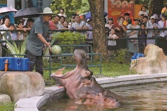 另外,王寿方每天会给每一只河马喂一个大西瓜。何故这么“小气”呢?其实,这是经过计算的。“西瓜糖分挺高的,吃多了河马也会有蛀牙。”王寿方说。