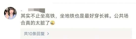 记者看到,引发网友热议的一条帖文写道,“大家出门坐高铁一定要穿长裤啊!你永远不知道上一个人在座位上干了什么,而且小桌板也是能不用就不用,要用最好拿酒精或者湿巾擦一下。”发帖者还配上坐下后背污染的裤子图片。