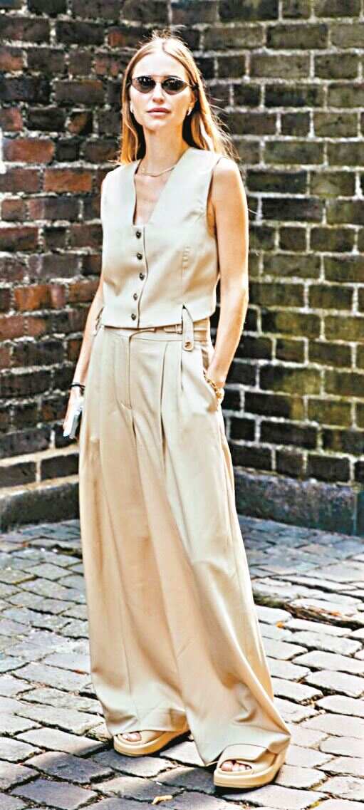■直接拿西装马甲去搭同色系裤装,利落感和高级感再升档。