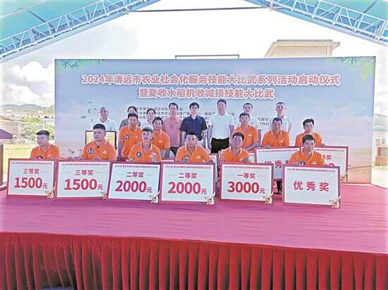 ■参加清远夏收水稻机收减损技能大比武的获奖选手上台领奖。